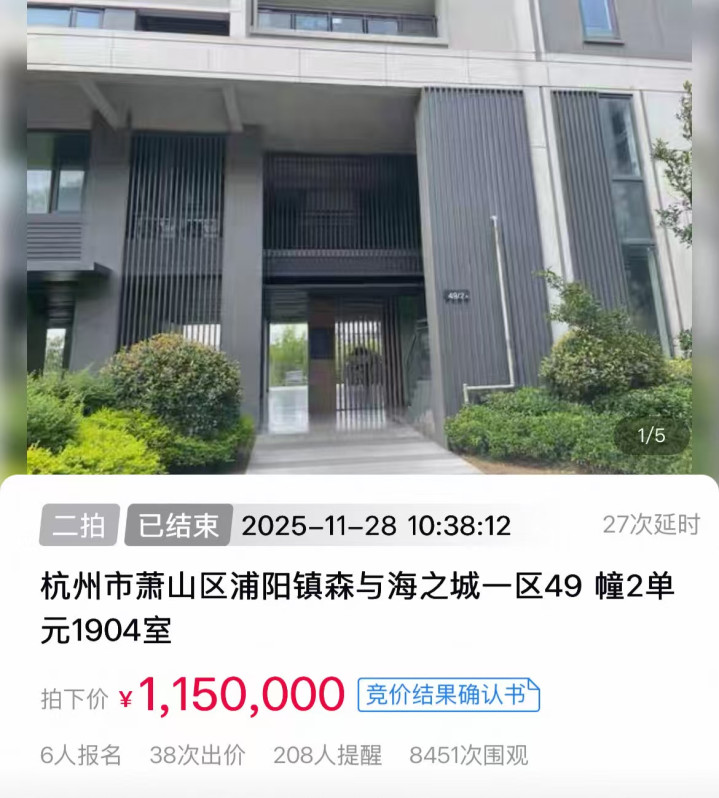还有网友表示,值得庆幸的是,这个成交价比之前一拍时的流拍价要高一些——10月底,这套森与海房源第一次法拍,以103万元起拍,却因无人报名而流拍;此次二拍起拍价降至83万元,折合起拍单价仅约6000元,由此吸引了不少意向竞买人来“捡漏”。