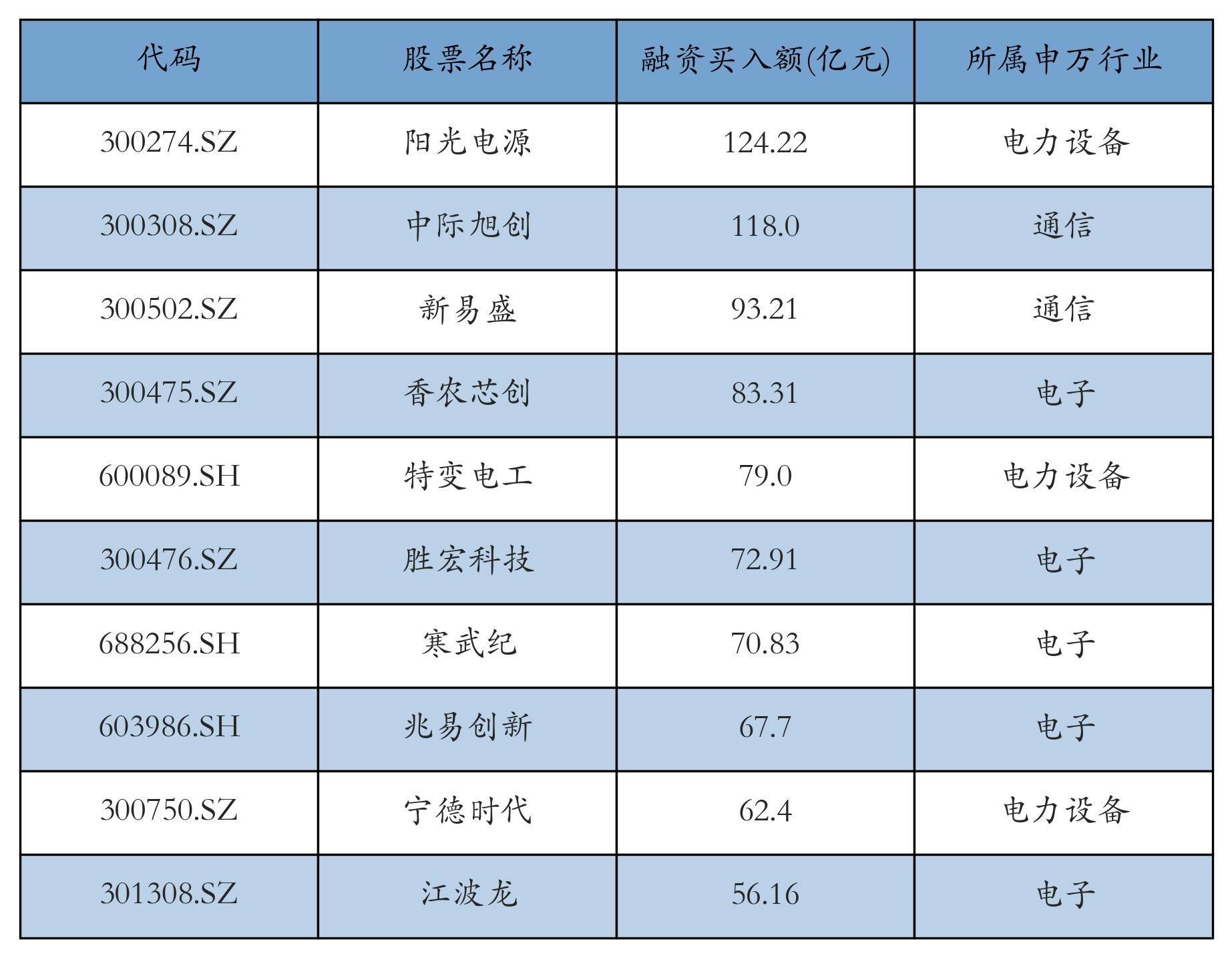 上周两市共有3463只个股有融资资金买入,共有182只个股买入金额超10亿元,其中阳光电源、中际旭创、新易盛排名前三,买入金额分别124.22亿元、118.0亿元、93.21亿元。融资买入额前10个股详情见下表: